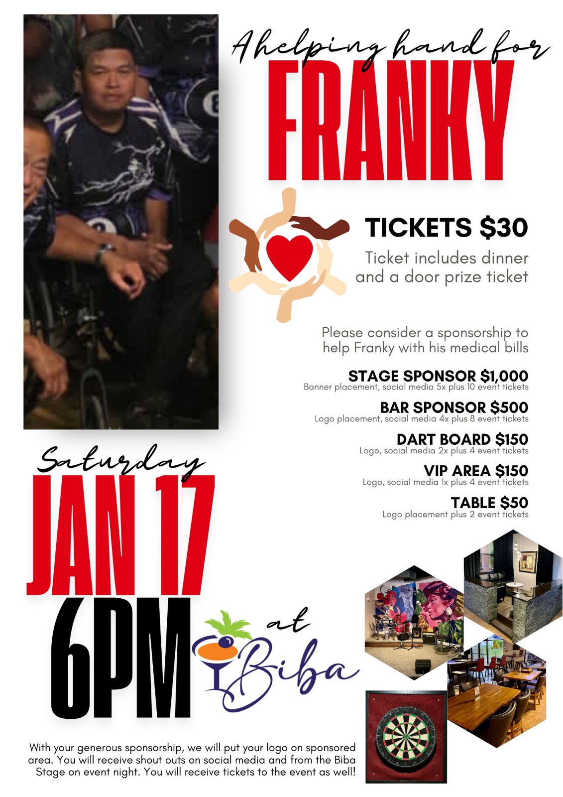 This is a medical Fundraieser for Franky Blas. Tickets are $20 dollars per person and will include dinner and 1 door prize raffle ticket.